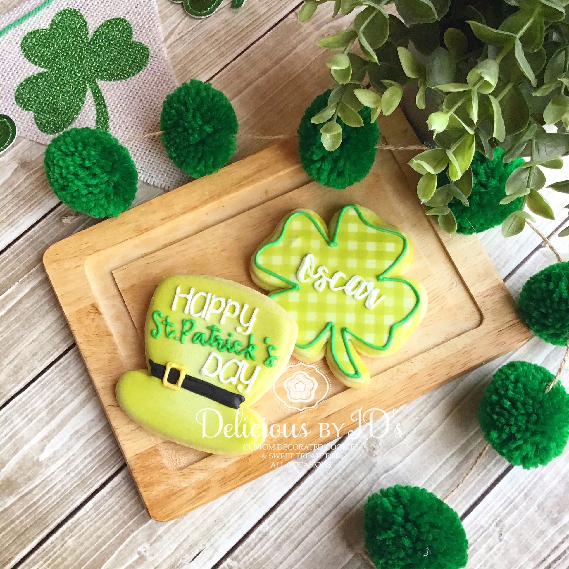 Personalized shamrock or hat cookie plaque or just simple Happy St Patrick’s Day! Cookie plaque comes individually wrap with a bow and tag. Ready to gift!